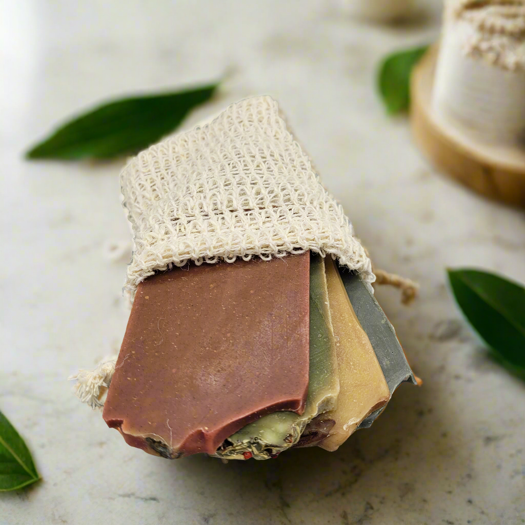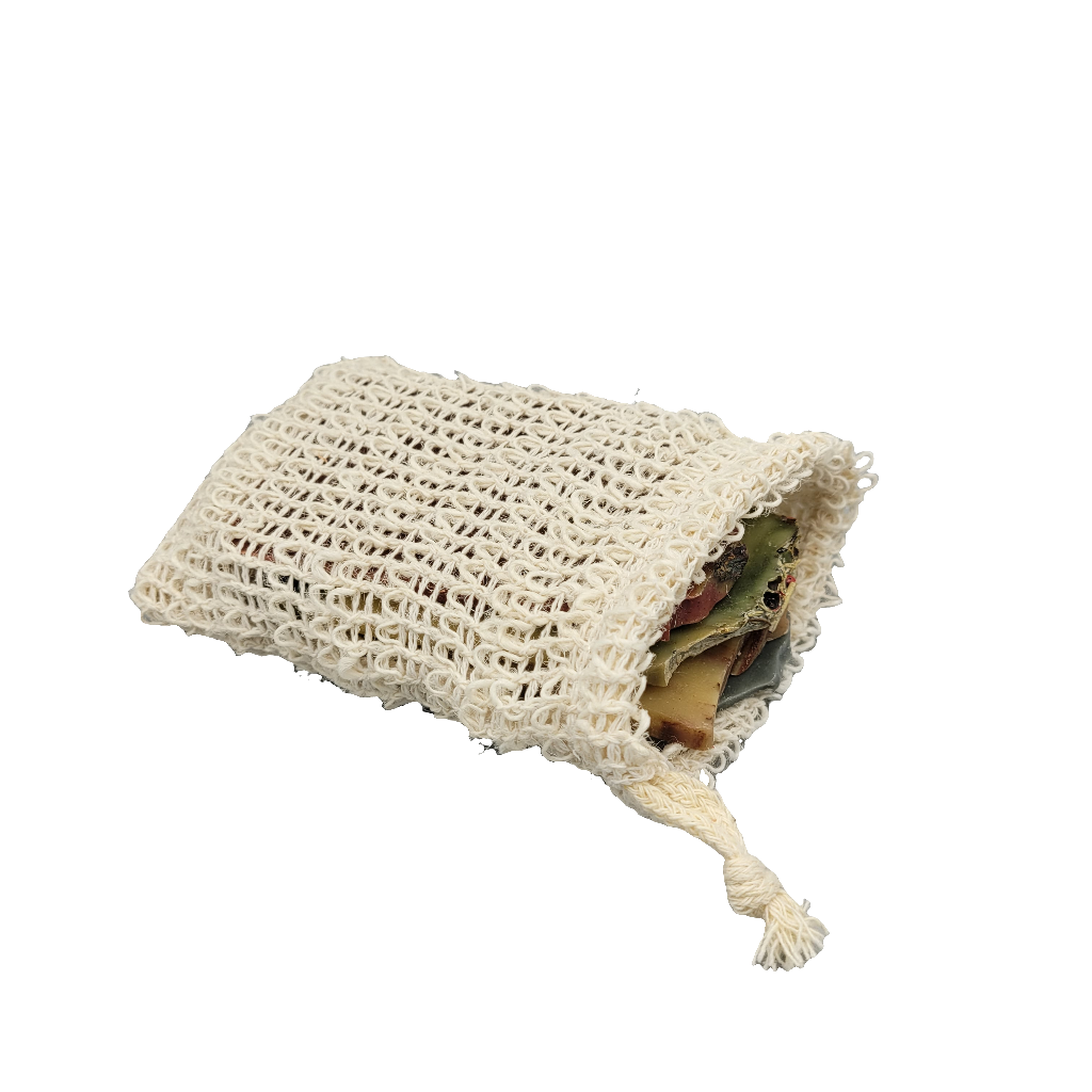 Our Sample Bundle Bag is a great way to try new soap scents without having to dedicate to a whole new bar. Each Sample Bundle Bag is packed with 4 or so soap slices selected at random, and packaged neatly in our soap saver sisal bags. Each Bundle bag has at least 5 ounces of soap slices included and can be used all at once ( if you love chaos), or each sliver can be used one by one in the saver bag, with another slice being added once the other runs low. This is one of our many ways that we reduce our waste by finding a home for the end pieces that are a by product of our soap cutting process.